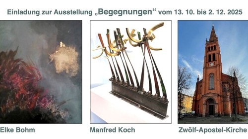 Ab dem 13. Oktober 2025 findet in der Zwölf-Apostel-Kirche die Kunstausstellung „Begegnungen“ statt. Sie endet am Dienstag, den 2. Dezember um 17:00 Uhr mit einer Finissage.